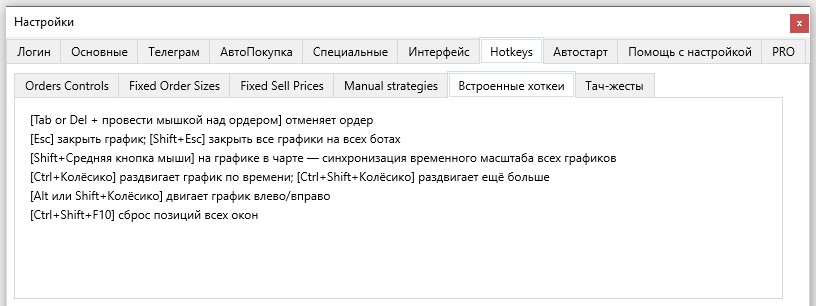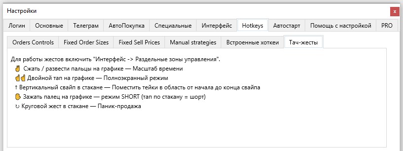 В верхней части вкладки Hotkeys расположен блок дополнительный вкладок: Orders Controls, Fixed Order Sizes, Fixed Sell Prices, Manual Strategies, Встроенные хоткеи и Тач-жесты.