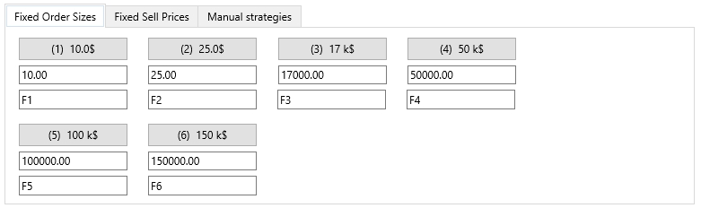 В верхней части вкладки расположен блок вкладок: Fixed Order Sizes, Fixed Sell Prices и Manual Strategies.