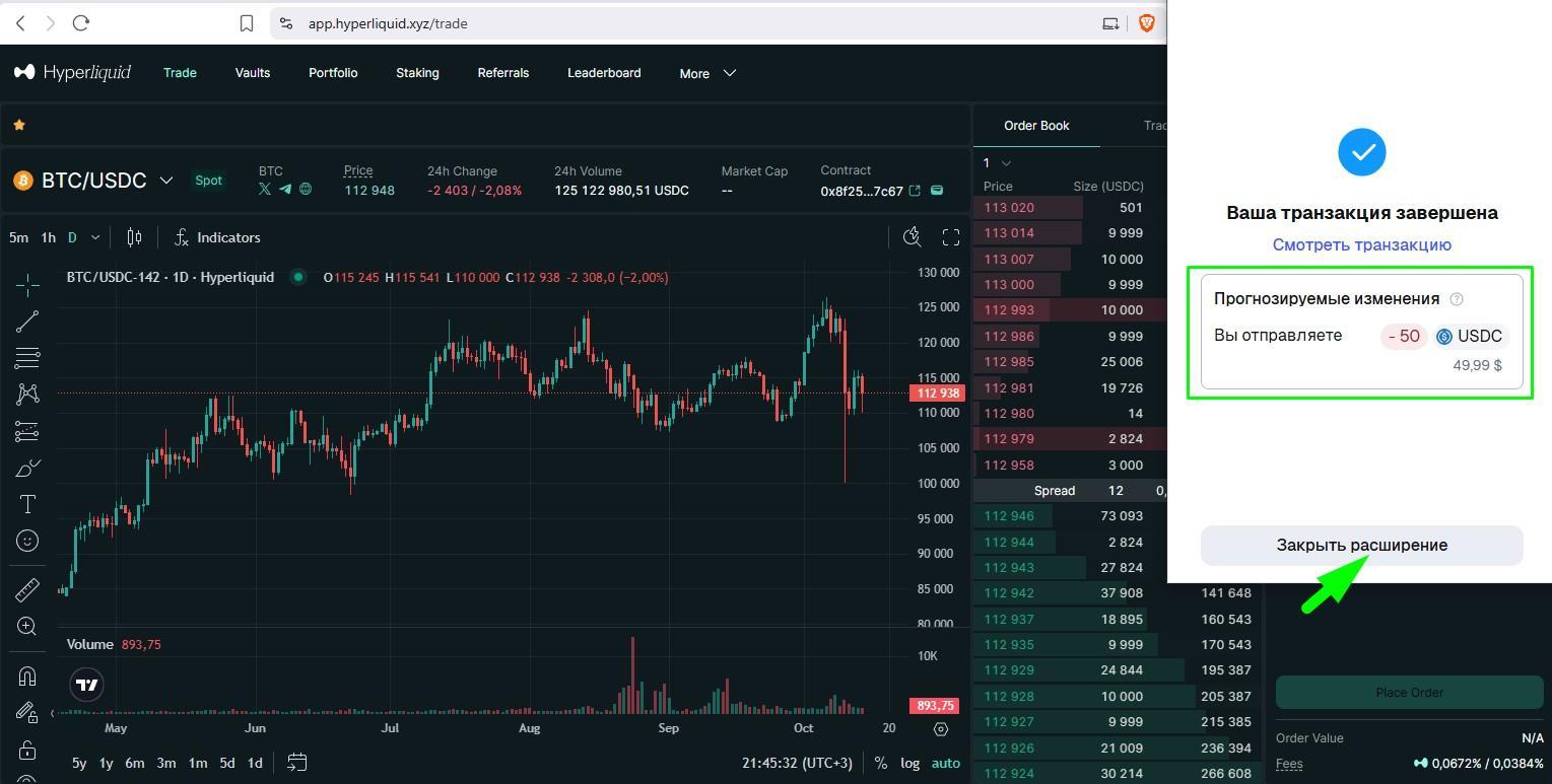 После подтверждения транзакции на бирже Hyperliquid указанная сумма USDC отобразится на фьючерсном балансе (Perps).