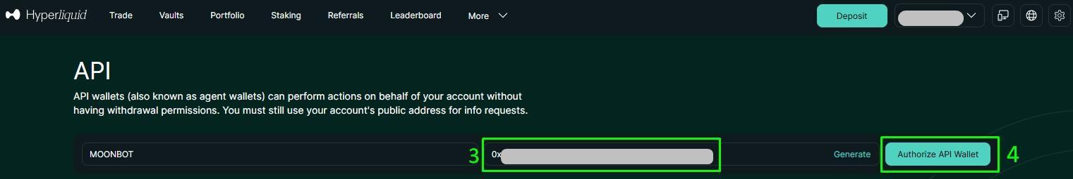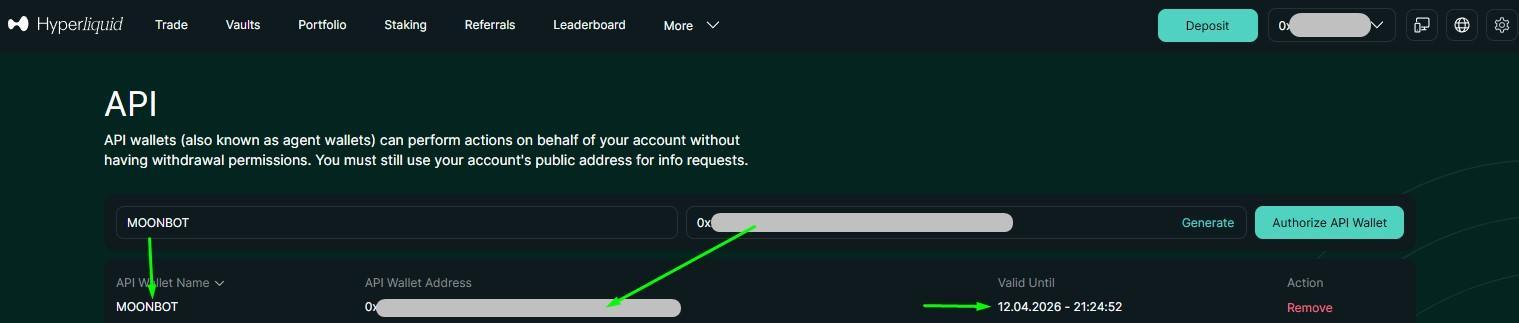 5) Скопируйте или сохраните API Wallet Address — он потребуется для ввода в терминале Moonbot;