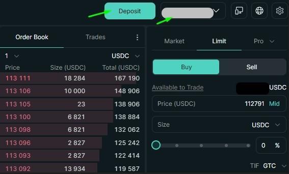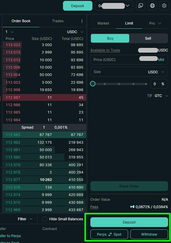 После успешного подключения на сайте Hyperliquid отобразится кнопка Deposit, а справа будет указан Ваш торговый адрес на бирже.