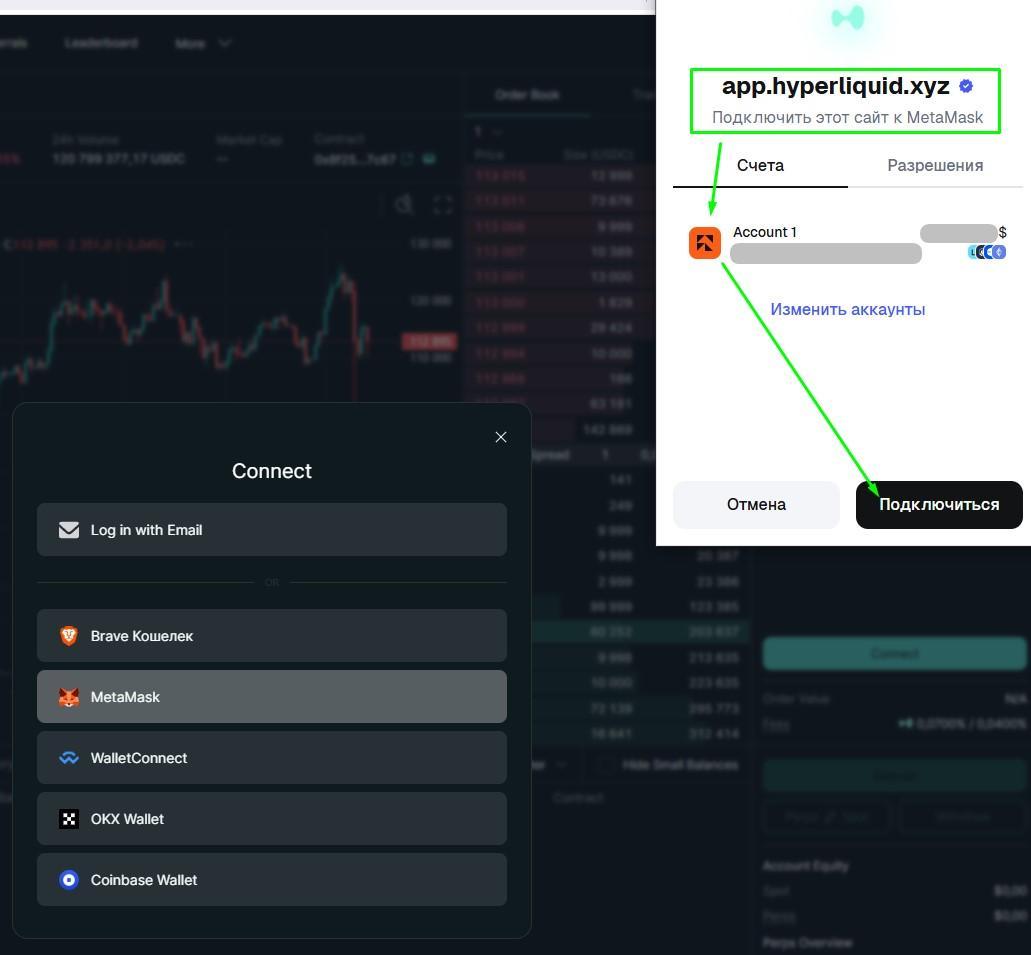 5) Выберите аккаунт, который будет подключён к бирже Hyperliquid и нажмите кнопку Подключиться.