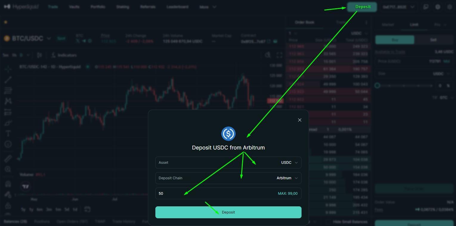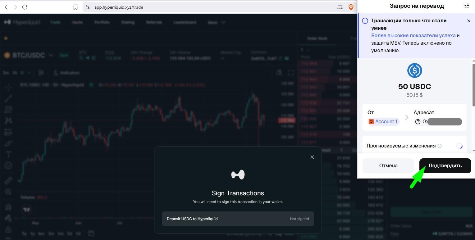 После пополнения баланса на сайте Hyperliquid выполните следующие действия:
