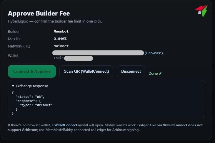 1. Комиссия на бирже Hyperliquid может взиматься как в USDC, так и в торгуемых монетах; актуальные ставки и способы их снижения указаны на странице 🔗https://hyperliquid.gitbook.io/hyperliquid-docs/trading/fees; дополнительно взимается небольшая комиссия разработчика терминала Moonbot, которая активируется при первом запуске терминала, подключённого к Hyperliquid; при первом запуске может появиться ошибка API-ключей и автоматически откроется страница 🔗https://api.moon-bot.com/files/HLsign.html с окном Approve Builder Fee; нажмите кнопку Connect & Approve, затем подтвердите операцию в браузерном кошельке; после появления статуса Done перезапустите терминал Moonbot от имени администратора; данную процедуру необходимо выполнить один раз для каждого аккаунта;