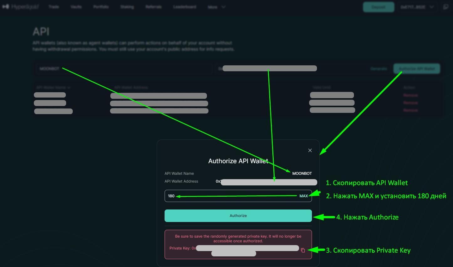 3) В поле 3 будет сгенерирован API Wallet Address; нажмите кнопку Authorize API Wallet;