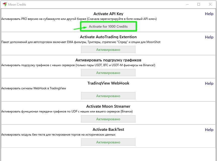 В правом нижнем углу главного окна терминала Moonbot нажмите на надпись PRO version, чтобы открыть окно Moon Credits с активациями платных модулей (см. рисунок ниже);