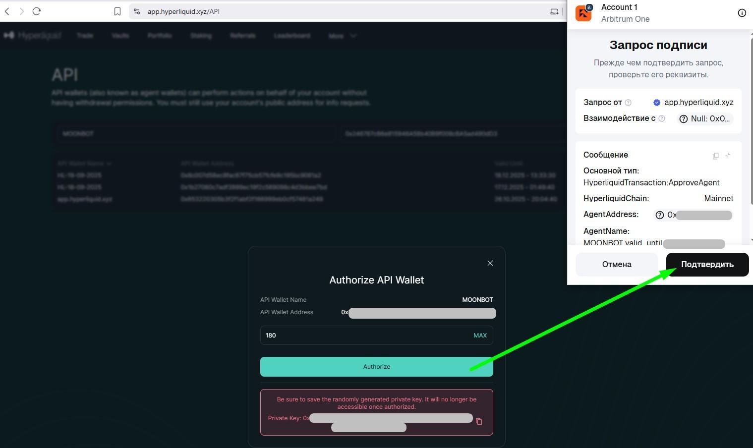 После этого откроется кошелек, в котором с помощью кнопки Подтвердить нужно подтвердить запрос подписи для создания API-ключей для биржи Hyperliquid.