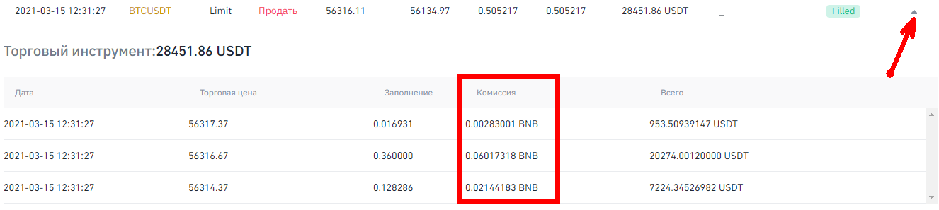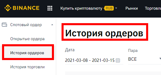 3) На бирже Binance откройте историю ордеров, найдите нужный ордер и разверните историю трейдов.