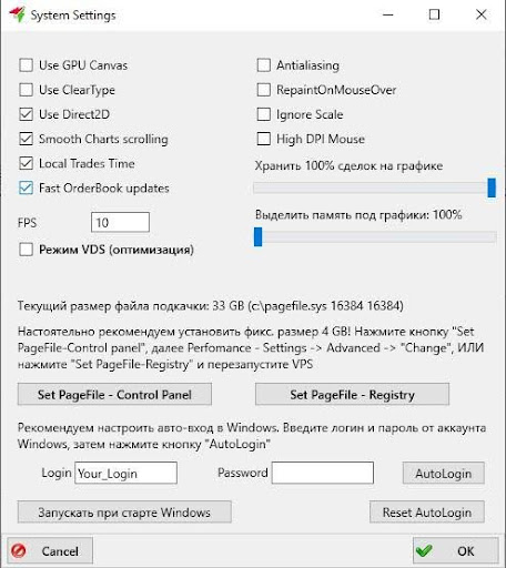 ☐ Выделить память под графики: ХХ%— параметр доступен при работе терминала на VDS с объёмом памяти 1 GB и включённым файлом подкачки.