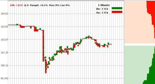 пусть задано DropsMaxTime = 100 сек, DropsPriceMA = 20 сек, DropsLastPriceMA = 1 сек, DropsPriceDelta = 2% — это означает, что Moonbot отслеживает изменение цены за последние 100 секунд. При этом на каждом интервале в 20 сек. он определяет среднюю цену в интервале. Из них он берет самую большую и сравнивает её с текущей рыночной ценой. Если текущая рыночная цена на 2% ниже самой большой цены, то стратегия срабатывает (например, самая большая цена была 102$, текущая цена 100$). Падение будет равно (102 / 100 - 1) * 100 = 2%.