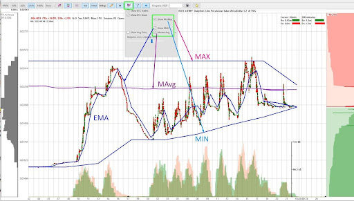 Вывести расчётные точки MAX/MIN, EMA и MAvg, соединённые для наглядности синими линиями на график, можно в меню кнопки Показывать графики\стаканы спотовых торгов (кнопка находится левее от кнопки Воронка), см. рис. выше.