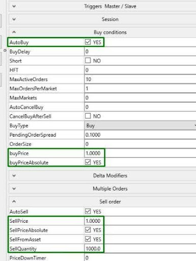 • buyPriceAbsolute: галочка YES/NO. Если YES, то buyPrice считается в абсолютном значении (например, 1$). Если NO, то цена buyPice считается в процентах от рыночной цены, например, при buyPice = 1 (%) Buy ордер будет выставляться на +1% от текущей цены, если buyPice = -1 (%), то Buy ордер будет выставляться на -1% от текущей цены.