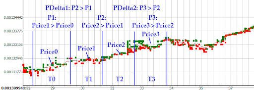 Суть стратегии - в детекте объёмов, при этом в ней задаются 4 интервала и проверяется, что средние цены и объёмы росли от предыдущего к последующему интервалу. Рост задаётся в процентах. Если задать 0 процентов, то условие превращается в «цена (объём) не упали». Для исключения проверки роста цены/объёма на конкретном интервале необходимо в нужном параметре указать большое отрицательное число, которое позволит пройти проверку этого условия, то есть проверка условия на этом интервале будет проходить всегда (кроме исключительных случаев реального падения цены/объёмов меньше указанного значения).