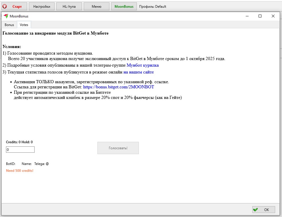 На вкладке Vote размещается информация и проводится голосование по вопросам подключения новых бирж к терминалу Moonbot.