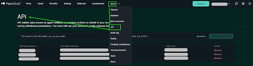 После пополнения баланса на сайте биржи Hyperliquid кликните на вкладку More, выберите пункт API, чтобы открыть страницу для создания API ключей.