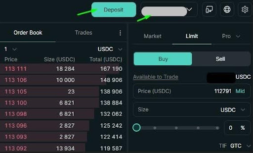 После удачного подключения на сайте Hyperliquid появится кнопка Deposit и правее Ваш торговый адрес на бирже.