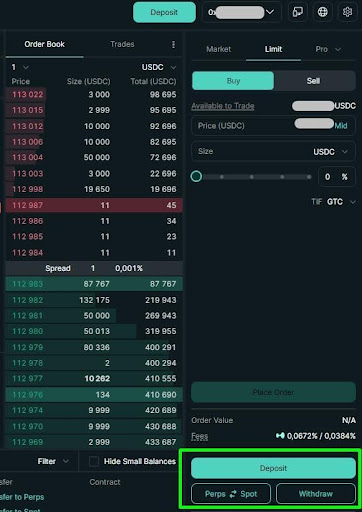 Перевести средства с фьючерсного баланса (Perps) на спотовый (Spot) можно на бирже Hyperliquid с помощью кнопки Perps-Spot с подтверждением действия через кошелек. Тут же можно снова пополнить депозит с помощью кнопки Deposit или вывести средства с помощью кнопки Withdraw обратно на подключенный к бирже кошелек с комиссией в 1 USDC.