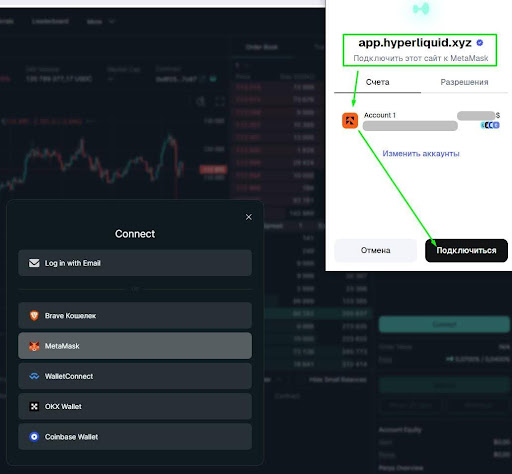 Далее следует создать и затем выбрать нужный аккаунт в кошельке, который будет подключен к бирже Hyperliquid и затем нажать на кнопку Подключиться.