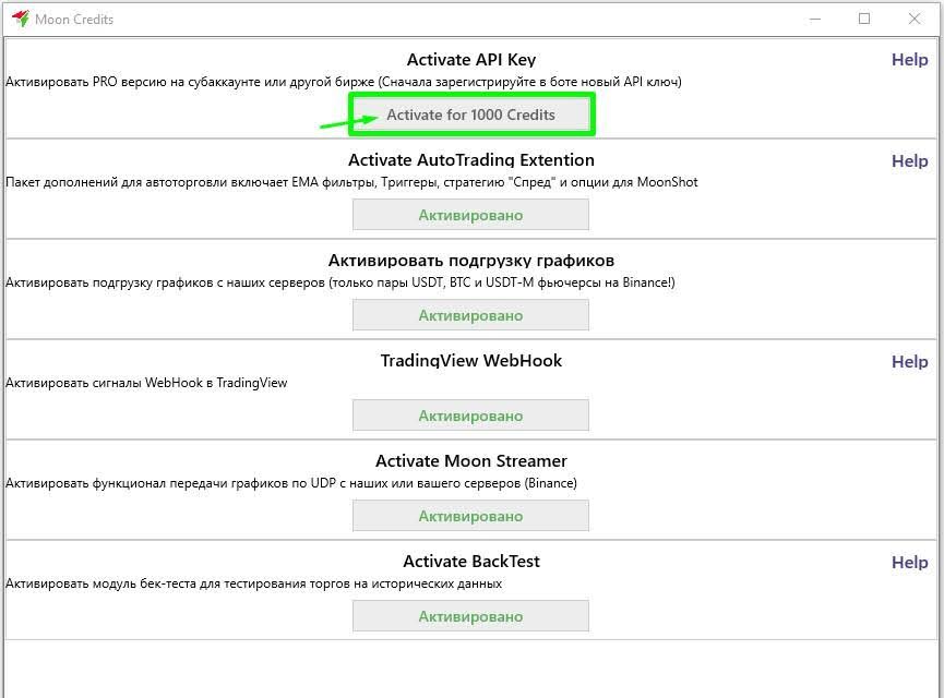 Кликните на надпись PRO version в правом нижнем углу главного окна терминала Moonbot, чтобы открыть окно Moon Credits с активациями платных модулей