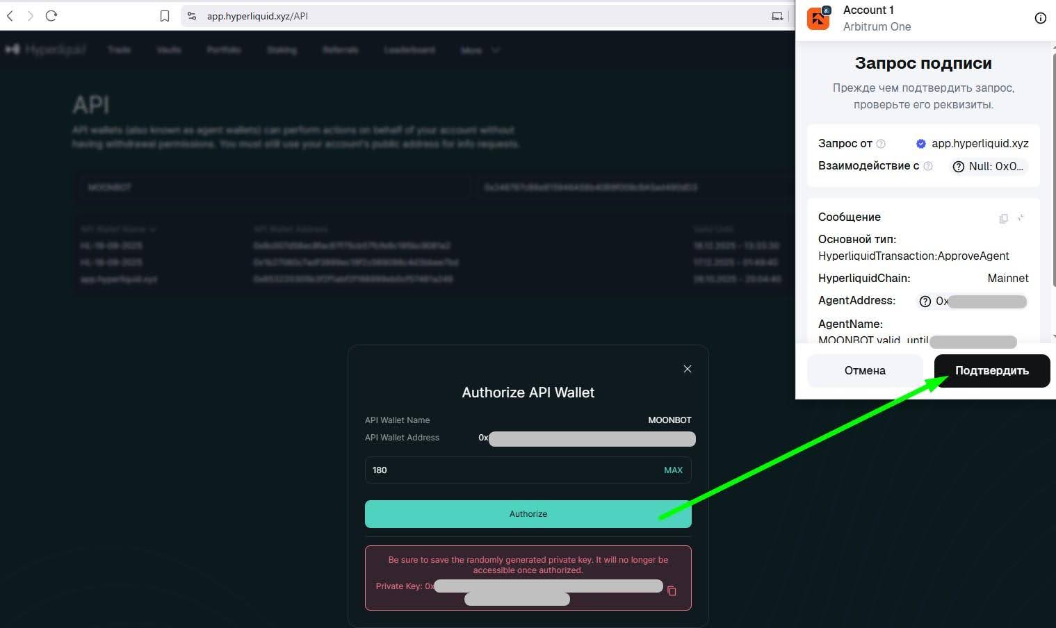 После этого откроется кошелек, в котором с помощью кнопки Подтвердить нужно подтвердить запрос подписи для создания API ключей для биржи Hyperliquid.