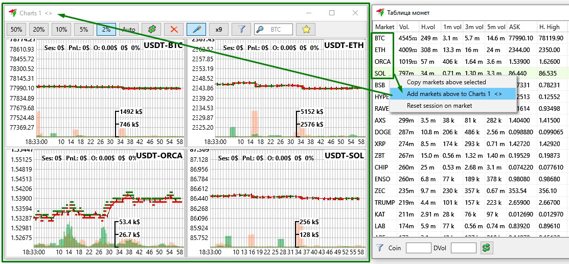 Пункт Add markets above to Charts используется, если нужно добавить группу монет от верхней до выбранной нижней в активное на данный момент окно-чарт. Для этого нужно кликнуть левой кнопкой мыши на монету, последнюю в выбранном списке, затем нажать правую кнопку мыши и кликнуть в меню на Add markets above to Charts. После этого выбранные монеты от нижней выделенной до верхней в списке будут добавлены в активное окно-чарт.