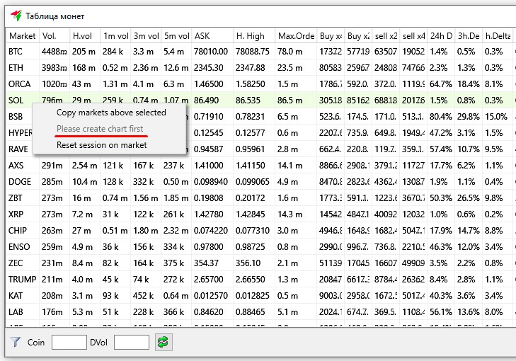 Самыми часто используемыми колонками в этой таблице являются колонки с дневными и часовыми объёмами, а также с часовой и 15-минутной дельтами. Эти колонки можно отсортировать, чтобы сверху отображались самые большие значения. После такой сортировки вы можете кликать на названия монет и открывать 5-10 графиков, на которых были самые большие объёмы или наибольшая волатильность. Далее можно вручную принимать решение о входе в сделку, запуске стратегий или выставлении отложенных ордеров.