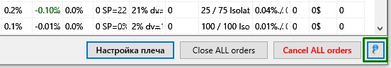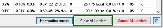 Кнопка "Close ALL orders", после предупреждения закроет все активные Sell ордера путём выставления V-STOP на уровень [buy +1%] и активирует Panic Sell на этих ордерах.