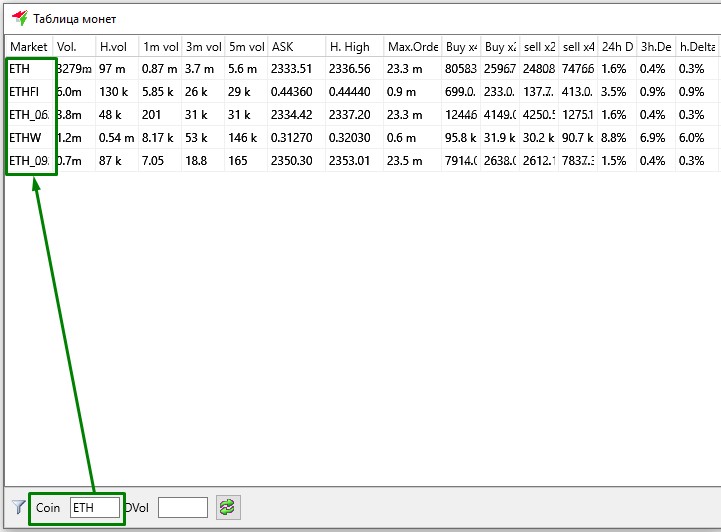 Поле "Coin" используется как фильтр для быстрого поиска нужных монет по колонке Market. В это поле можно вводить только одну монету для поиска.