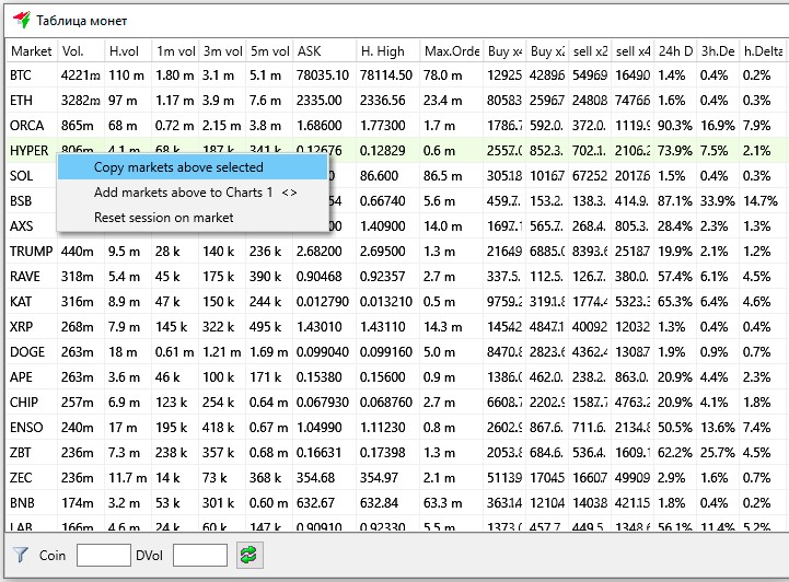 Для этого нужно кликнуть левой кнопкой мыши на монету, последнюю в выбранном списке, затем нажать правую кнопку мыши и кликнуть в меню на Copy markets above selected. Все монеты от выбранной до верхней будут скопированы в буфер обмена в виде одной строки с перечислением через запятую (для примера на скриншоте BTC,ETH,ORCA,HYPER), после этого их можно вставить в настройки белого или черного списка монет, в Блокнот или в Excel для дальнейшего использования по своему усмотрению.