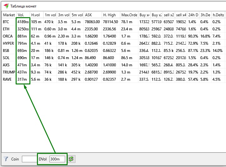 Поле "DVol" используется как фильтр по дневным объемам по колонке Vol. При вводе значения в это поле в Таблице монет будут скрыты все монеты, дневной объём которых меньше введённого числа. В этои поле можно вводить значения "только числа" (300000), а также "числа с k" (тысячи, например 300k) и "числа с m" (миллионы, например 300m).