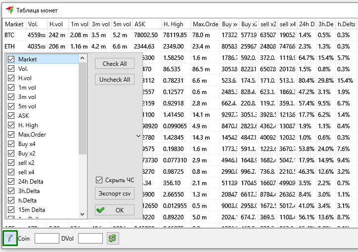 Кнопка “Воронка” (Фильтры колонок) открывает окно с дополнительными настройками Таблицы монет.