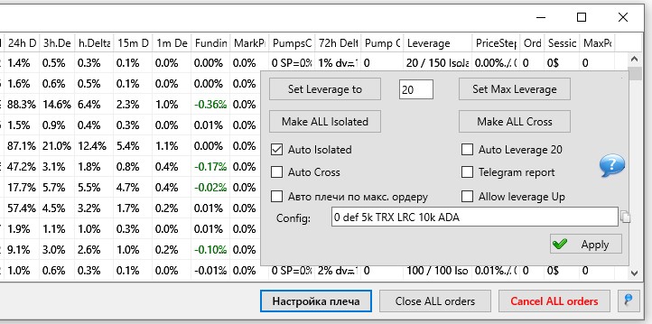 MaxPos – значение максимальных позиций на монетах для управления плечами на фьючерсном рынке. В поле этой колонки можно самостоятельно вписывать значения, которые будут учтены в поле Config (кнопка Настройка плеча) максимальных позиций монет. По умолчанию все значения установлены в нулевые.