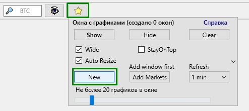 Пункт Please create chart first появляется в меню вместо Add markets above to Charts, если у Вас ещё нет ни одного окна-чарта. В этом случае нужно создать новое окно-чарт, для этого на главном окне терминала Moonbot кликните правой кнопкой мышки на иконку "Жёлтая звезда" и в окне настроек нажмите на кнопку "New".