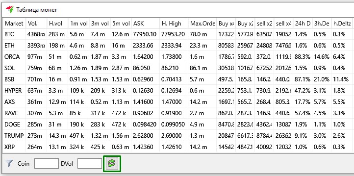 После нажатия на кнопку Смотреть маркеты откроется отдельное окно Таблица монет, в котором отображается список монет, доступных для торговли на выбранной торговой паре. В этом окне, также присутствуют дополнительные колонки с данными и вспомогательные настройки.