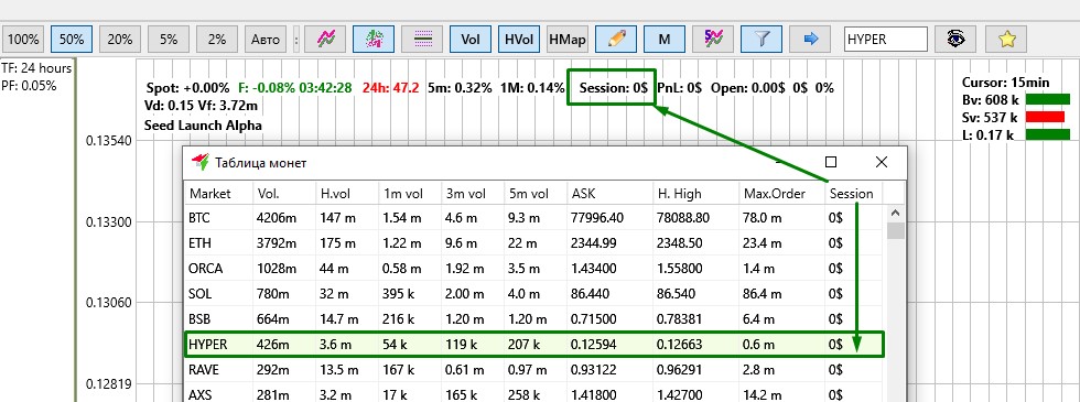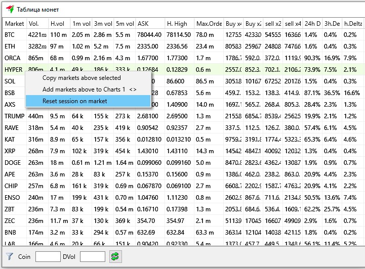 Пункт Reset session on market используется, если нужно сбросить значение сессии только на одной выбранной монете. Для этого нужно выбрать нужную монету, кликнуть правой кнопкой мыши на ней и в меню выбрать пункт Reset session on market. После этого сессия по данной монете будет обнулена, как в Таблице монет в колонке Session, так и на графике этой монеты.