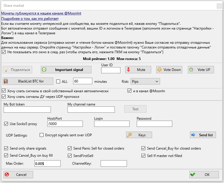 Введите полученный бот-токен в поле My Bot token в окне Share market ;