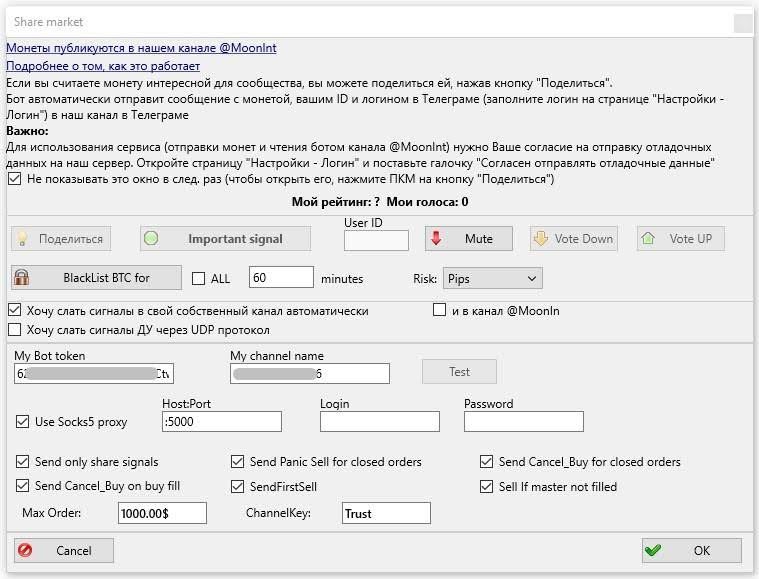 Если Вы хотите, чтобы терминал отправлял команды в Ваш собственный Telegram канал автоматически без нажатия на кнопку “Поделиться”, то поставьте галочку «Хочу слать сигналы в свой собственный канал автоматически». Если хотите дублировать команды в Telegram канал @MoonInt, то следует установить галочку рядом с опцией «и в канал @MoonInt».