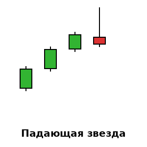 Свеча с маленьким телом в нижней части и длинной верхней тенью (в 2-3 раза длиннее тела). Появляется в конце восходящего движения и сигнализирует о возможном развороте вниз. Покупатели пытались поднять цену выше, но продавцы отбили эту попытку и вернули цену к уровням открытия.