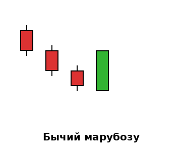 Свечи без теней или с минимальными тенями, где цена открытия совпадает с одним экстремумом, а закрытия — с другим. Белая марубозу (открытие = минимум, закрытие = максимум) показывает сильное бычье настроение, чёрная — медвежье.
