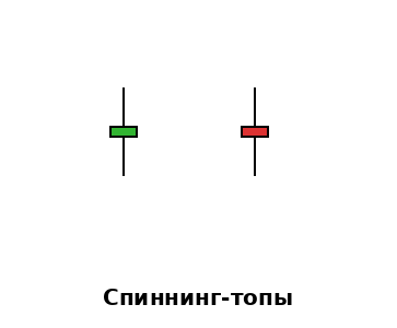 Candles with small bodies and long wicks on both sides, resembling tops. They reflect market indecision and a balance between buyers and sellers. In a trending market, they often precede a continuation of the trend after a brief pause.