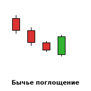 A two-candle pattern where the second candle fully “engulfs” the body of the previous one. Appears after a downtrend and signals a potential upward reversal. The first candle is red, and the second green candle opens below the first candle’s low and closes above its high — buyers have taken control from the sellers.